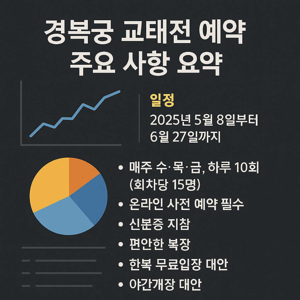 - 예약 방법: 국가유산청 궁능유적본부 홈페이지의 통합예약 > 행사예약 메뉴에서 ‘2025 경복궁 교태전 특별개방’을 찾아 신청합니다. 컴퓨터나 스마트폰으로 간단히 할 수 있습니다.