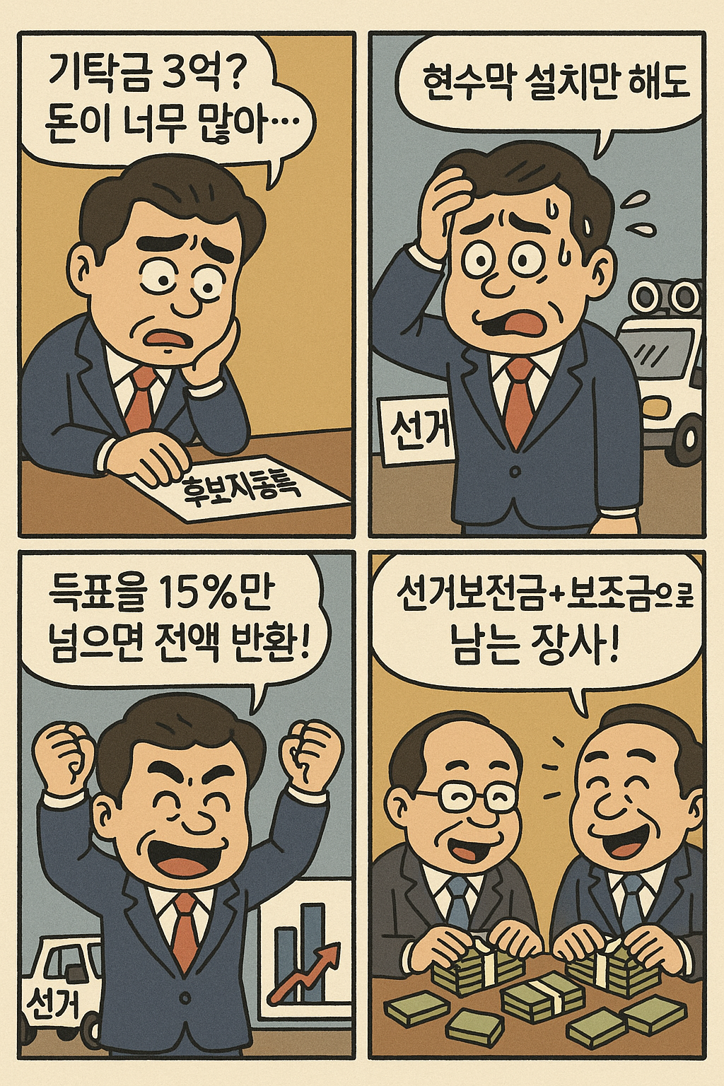 대한민국 대통령선거가 다가오면서 유권자들 사이에 ‘비용’ 이야기가 화제입니다. 복잡하기만 한 선거 자금 구조를 딱 4컷 만화로 정리해 보았습니다. 기탁금부터 선거비용 보전, 보조금까지 한눈에 확인해 보세요!