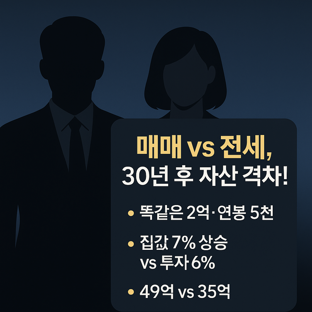 집 매매와 전세 중 무엇이 더 유리할까요? 현재 소득과 자산을 바탕으로 30년 후 자산 변화를 예측하고, 매매 vs 전세 선택의 핵심 고려사항과 부동산 투자 전략을 상세히 알려드립니다.