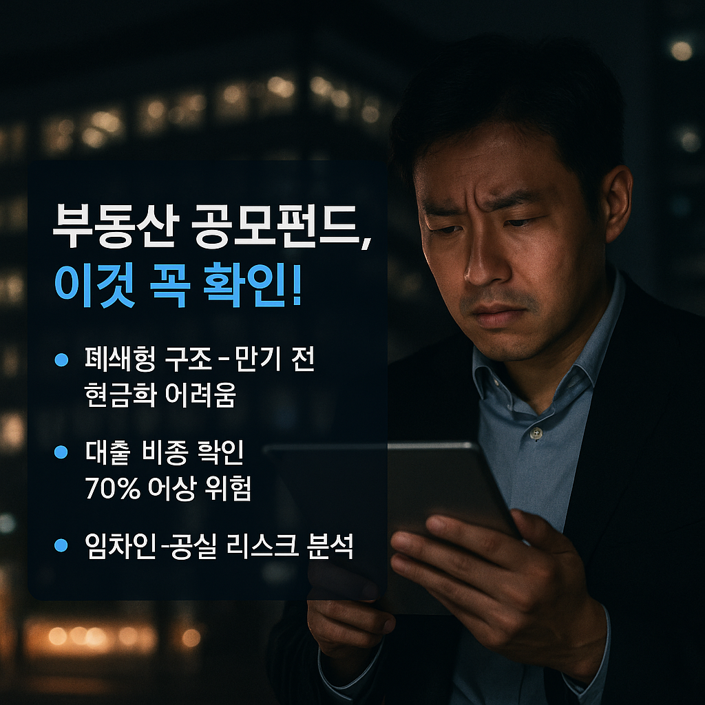 부동산 공모펀드는 높은 임대 수익률을 기대할 수 있지만, 장기간 자금이 묶이고 원금 전액 손실 위험까지 있다는 점을 반드시 기억해야 합니다.