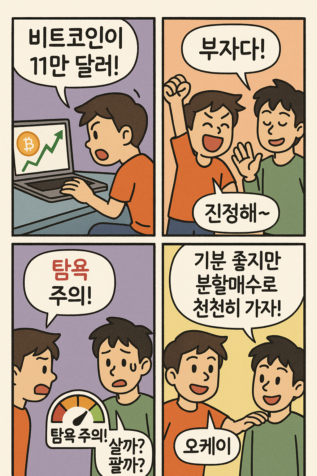 | 4컷 | B: “기분 좋지만 분할매수로 천천히 가자!” / A: “오케이” | 분할매수·리스크 관리로 장기전 대비 |