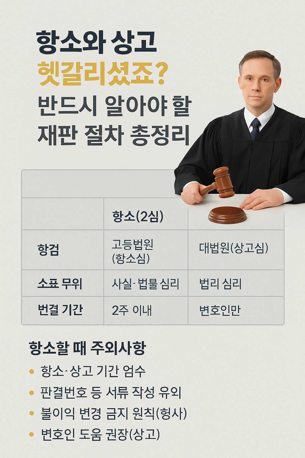- 항소·상고 기간 엄수: 민사항소/상고는 판결송달 후 2주, 형사항소/상고는 선고 후 7일이 기산점입니다. 기한을 놓치면 항소·상고 권리가 사라집니다.
