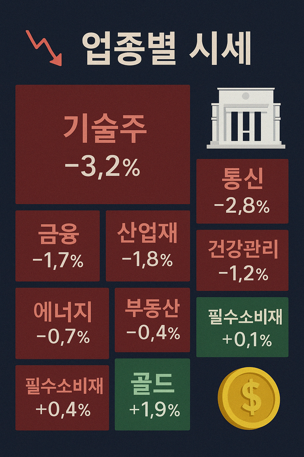 섹터별로는 기술주가 ‑3 %대 급락하며 붕괴했고, 안전자산으로 분류되는 금 관련주는 +1 %대 상승했습니다.