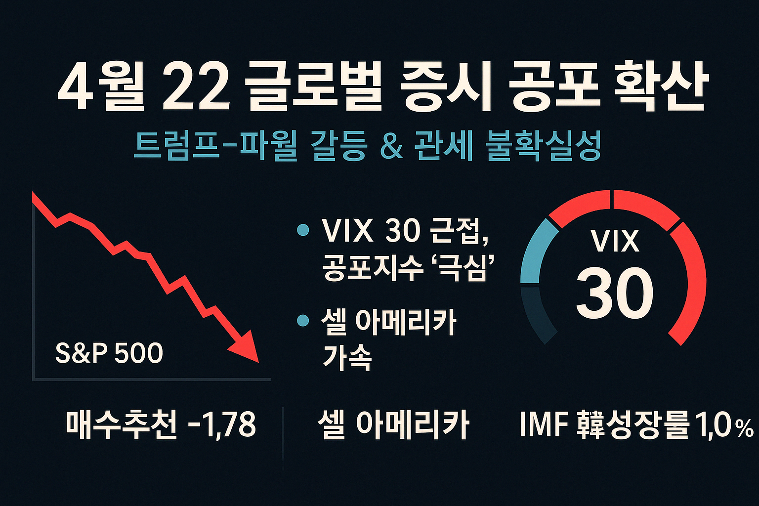 - VIX 지수(변동성 지수): 시카고 옵션거래소(CBOE)에서 산출하는 지수로, S&P500 옵션의 내재변동성을 기반으로 계산됩니다. 현재 VIX는 30 근처로 급등해 '극심한 공포' 구간에 진입했습니다. 일반적으로 VIX가 20 이상이면 시장 불안정성이 높다고 판단합니다.