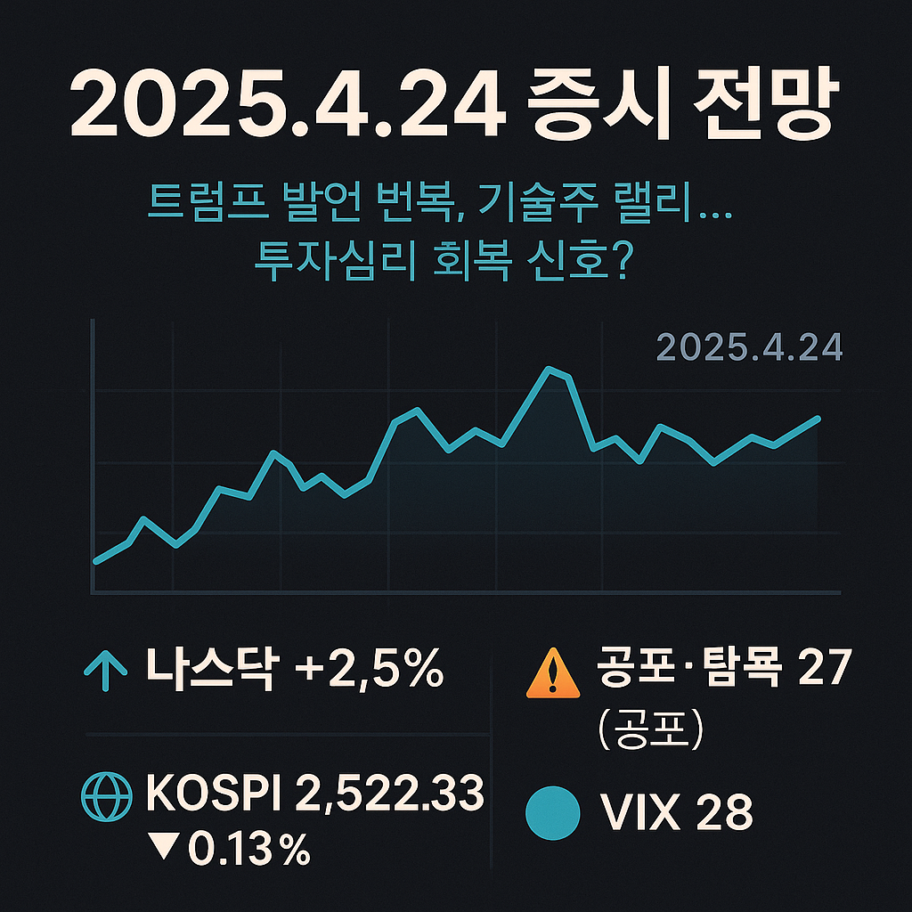 전일(23일) 뉴욕 증시는 트럼프 대통령의 완화된 발언과 일부 기술주의 실적 호조에 힘입어 이틀째 상승 마감했습니다. 다우 지수는 장중 한때 1,100포인트 폭등 후 약 +400포인트 상승으로 마쳤고, 나스닥 지수는 2.5% 급등하며 투자 심리가 크게 개선되었습니다. 이러한 긍정 모멘텀은 금일 아시아 시장과 국내 증시에까지 영향을 주어, 장 초반 투자심리는 강세를 보였습니다. 하지만 국내 1분기 GDP 역성장 소식과 미·중 통상 불확실성 등 거시적 우려가 혼재되면서 증시 흐름은 오후 들어 출렁이는 모습을 보였습니다.