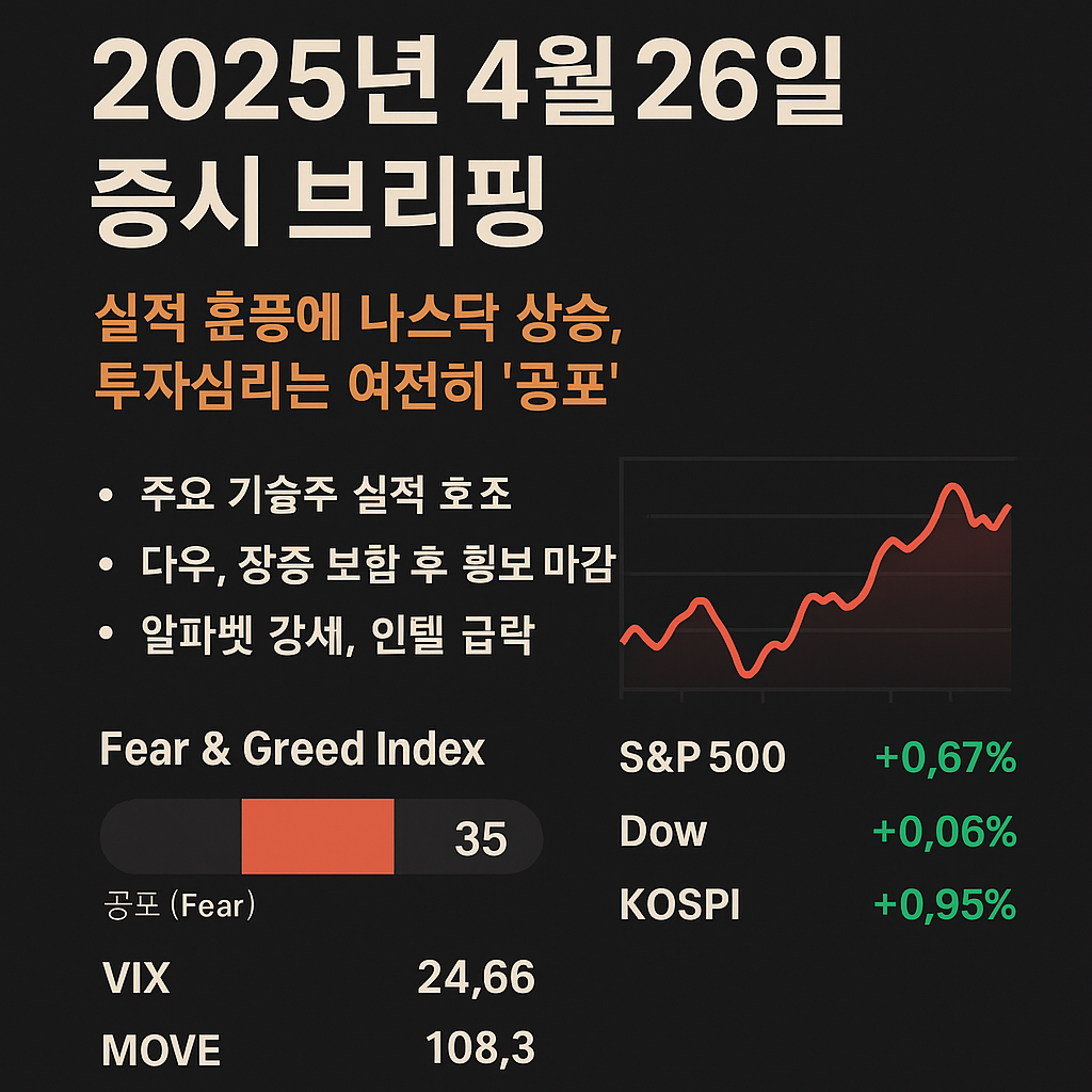 주요 기술주의 깜짝 실적 호조로 미국 증시가 상승 마감했습니다. 나스닥 지수는 알파벳 등 빅테크 주도의 랠리로 강세를 보였고, S&P500 지수도 4일 연속 올랐습니다. 하지만 CNN 공포와 탐욕 지수는 여전히 ‘공포’ 수준에 머물고 VIX 변동성 지수 역시 높은 수준을 유지하는 등 투자 심리는 불안정한 모습입니다.