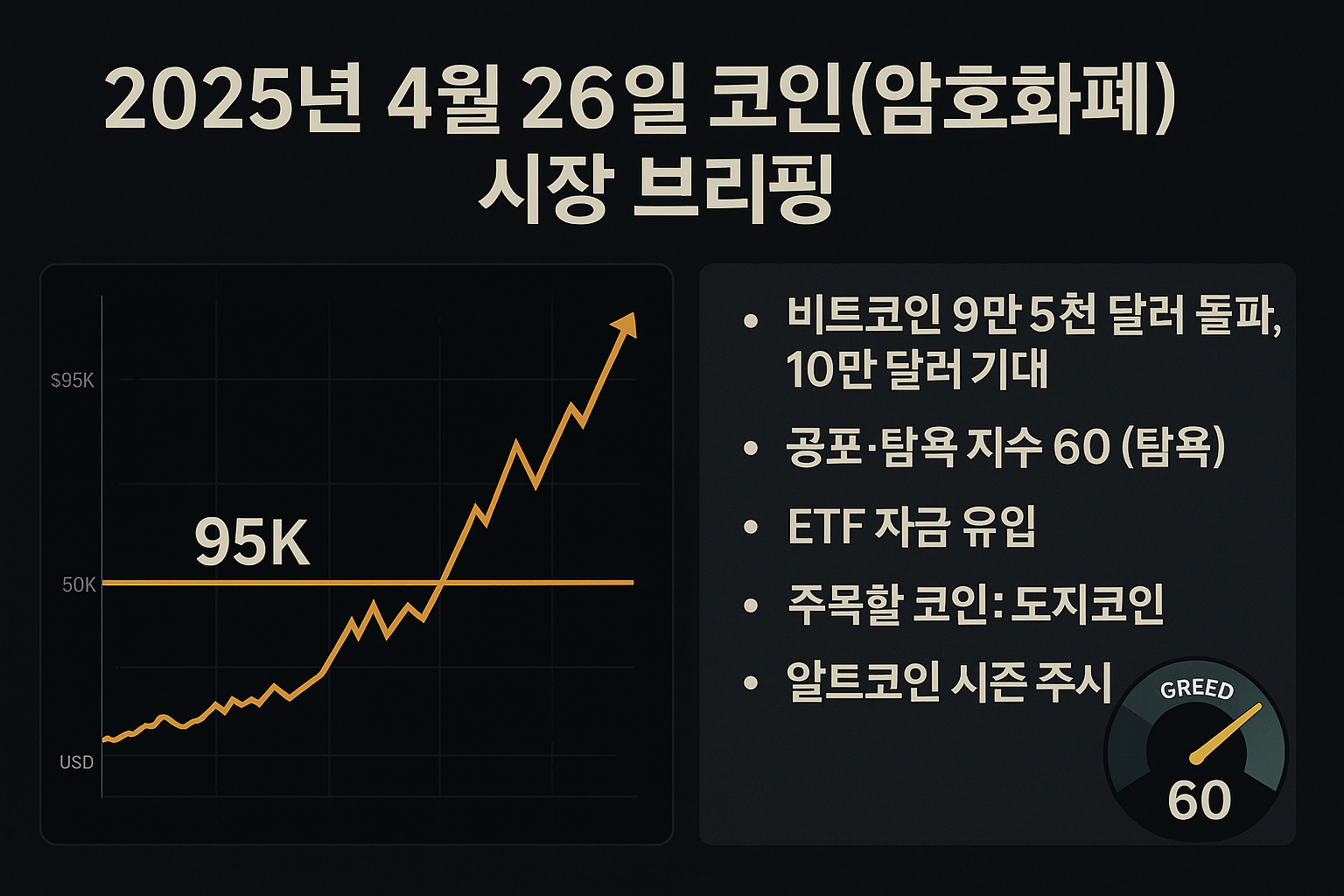 오늘 암호화폐 시장은 전반적으로 상승 추세를 이어가며 투자 심리도 개선되는 모습입니다. 간밤 비트코인은 9만 5천 달러 선을 재돌파했고, 알트코인들도 강세를 보였습니다. 공포와 탐욕 지수는 현재 '탐욕(Greed)' 단계인 60을 기록하고 있어, 며칠 전의 극단적 탐욕(72) 수준에서 다소 진정되었지만 여전히 투자자들의 낙관론이 우세한 상황입니다. 한편, 해킹 사건과 일부 규제 이슈 등 경계 신호들도 상존하여 신중한 낙관론이 필요해 보입니다.