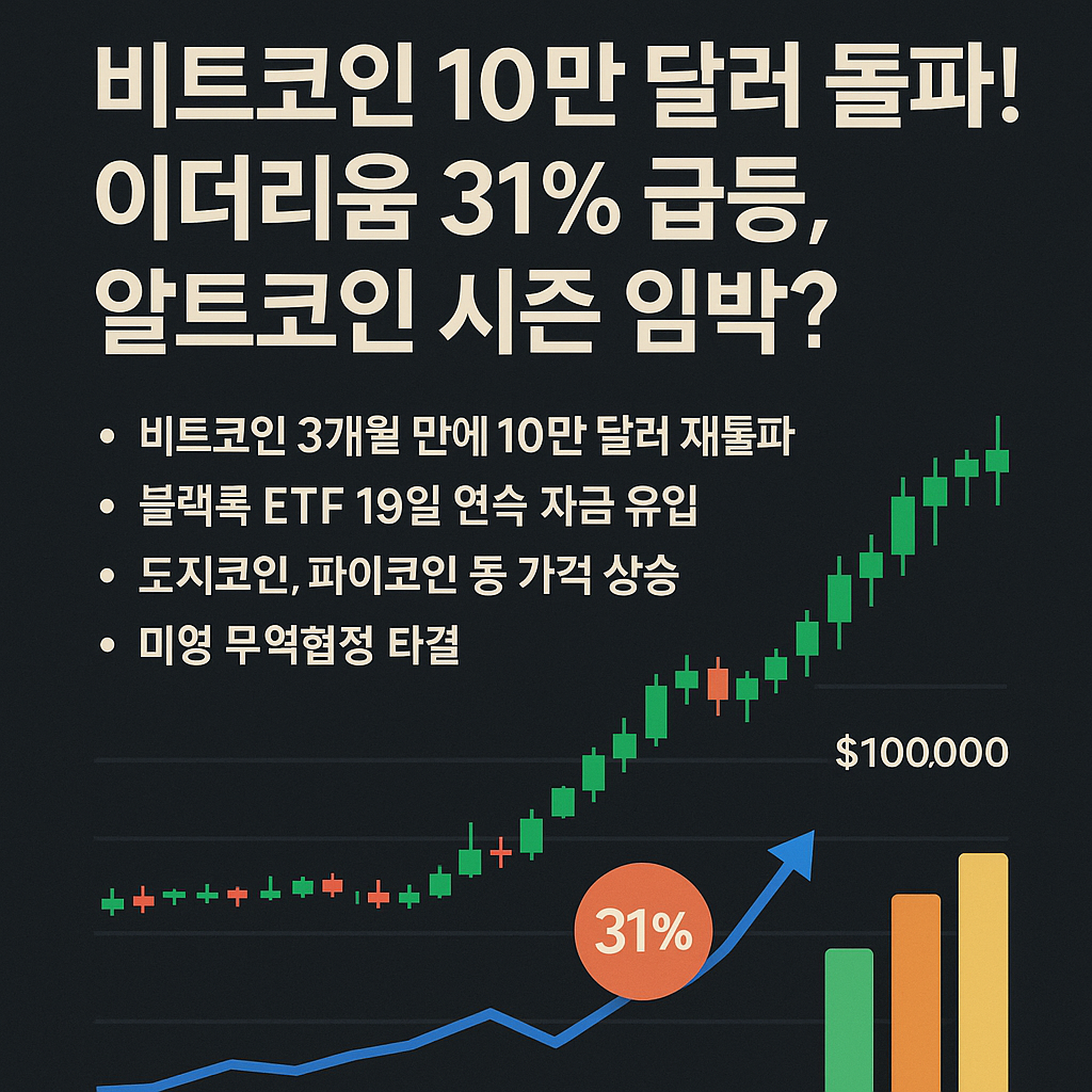 2025년 5월 암호화폐 시장은 비트코인의 10만 달러 재돌파와 이더리움의 31% 급등으로 뜨겁게 달아오르고 있습니다. 블랙록 ETF의 지속적인 자금 유입과 기관 투자자들의 매수세, 미영 무역협정 타결 등이 시장에 긍정적인 영향을 미치고 있으며, 알트코인 시즌의 시작 조짐도 보이고 있습니다.