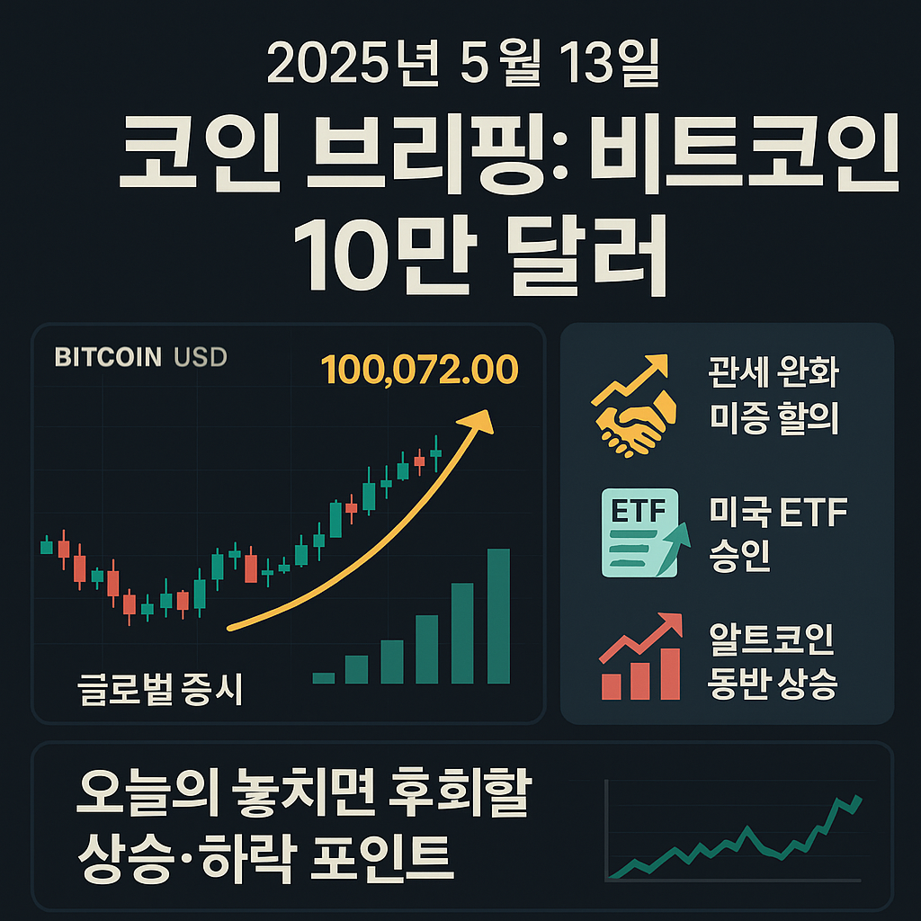 2025년 5월 13일 06시 코인(암호화폐) 브리핑: "비트코인 10만 달러 시대, 관세 완화·ETF 호재에 알트코인도 질주! 오늘 놓치면 후회할 상승·하락 포인트 완벽 정리"