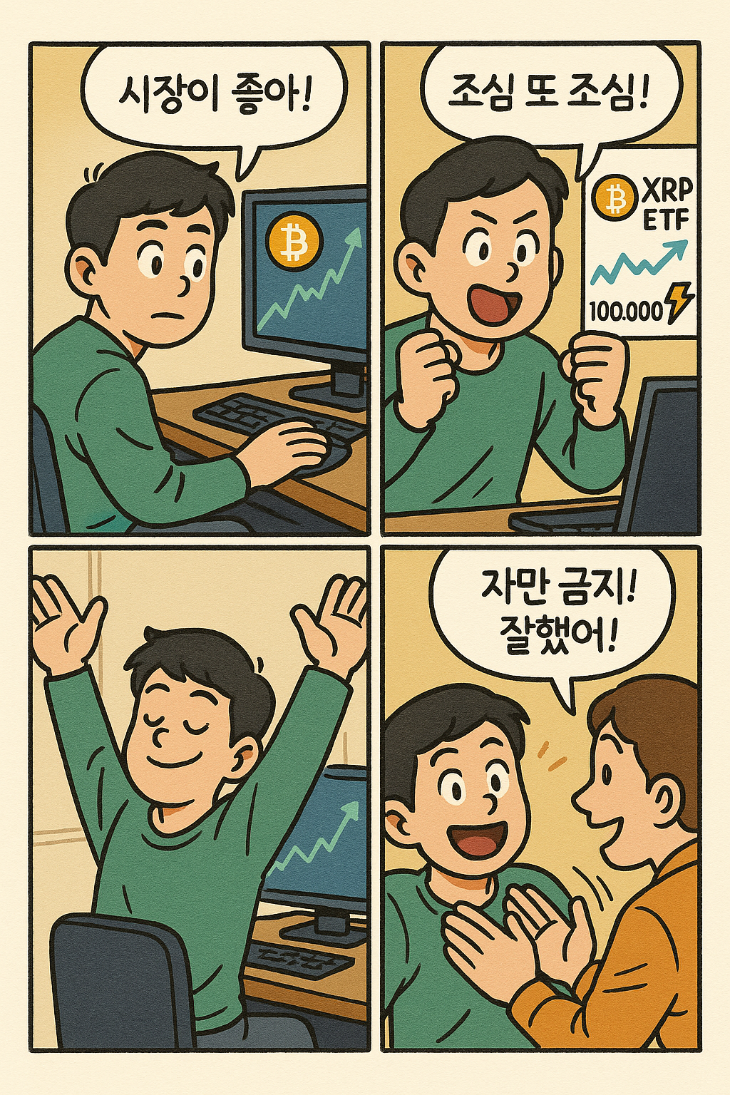 흔히 “시장은 차갑고 투자자는 뜨겁다”라고 하죠. 오늘은 만화로 가볍게 웃으며, 하지만 리스크 관리는 잊지 않는 하루를 보내보세요. 🧑💻💰