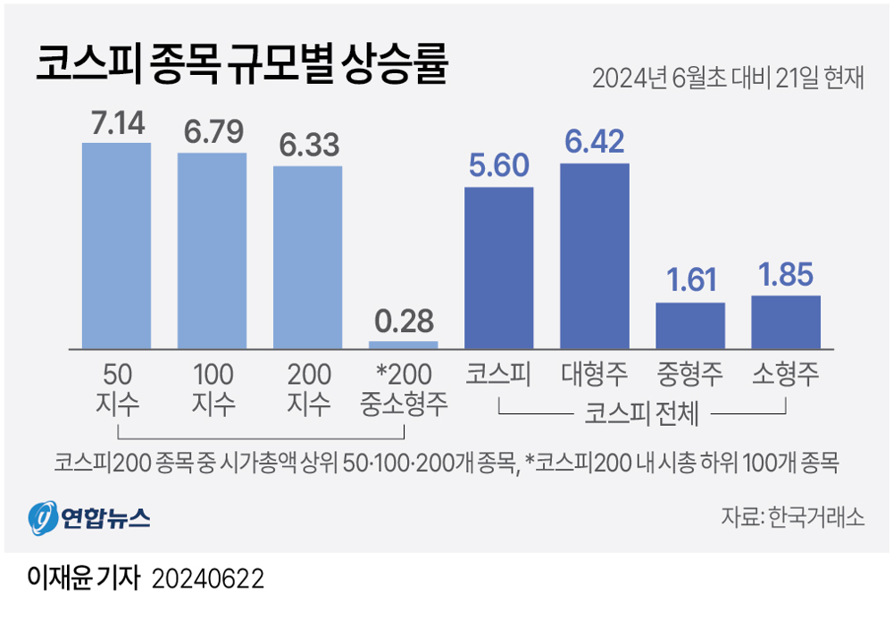 위 인포그래픽은 코스피 시가총액 규모별 상승률을 보여준다. 대형주(코스피50)의 올 들어 상승률이 7.14%로 전체 코스피(5.60%) 대비 높은 수익률을 기록했다. (출처: 연합뉴스 그래픽) 코스피200 중 대형주가 상대적으로 강세를 보여왔음을 알 수 있다. 실제로 기관은 대형주 위주의 매수를 지속했고, 소형·중형주는 정치테마주 변동성 등으로 등락이 엇갈렸다. 글로벌 감세·재정정책 추이와 미·중 통상 협상 동향, 원자재 가격, 환율 등 여러 변수 속에서 대형 IT·제조업종에 대한 선별적 투자가 이어졌다.
