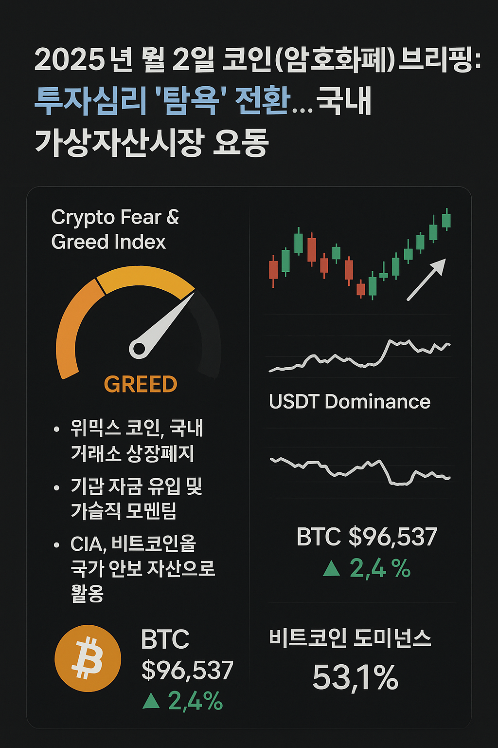 5월 2일 암호화폐 시장은 투자심리 ‘탐욕(Greed)’ 단계로 전환되며 강세를 나타냈습니다. 공포·탐욕 지수는 전일 대비 상승하며 67점(탐욕 단계)을 기록했는데, 이를 반영하듯 이날 오전 9시경 비트코인(BTC)은 전일 대비 약 2.4% 오르며 96,537달러를 돌파했고, 이더리움(ETH)과 리플(XRP) 등 주요 알트코인들도 1~2%대 상승세를 보였습니다. 이러한 분위기에서 기관 자금 유입과 강력한 기술적 모멘텀이 맞물리며 가격이 고점을 갱신했고, 전반적으로 투자자들의 위험자산 선호도가 높아진 하루였습니다.