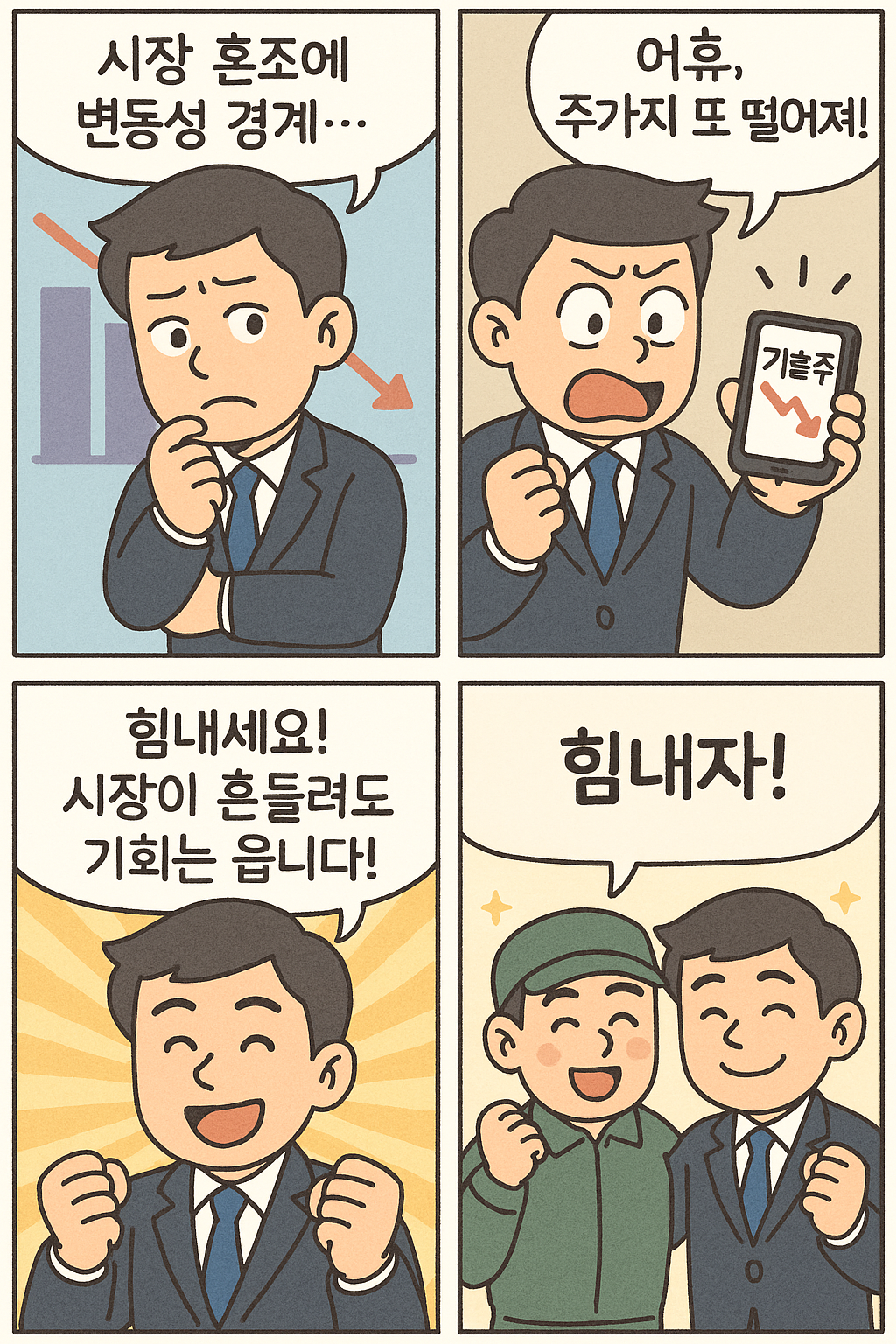 무디스 신용등급 강등 여파에 기술주는 약세, 방산주는 강세! 그래도 기회는 살아 있습니다. 네 컷 만화로 오늘의 포인트와 응원 메시지를 함께 전해드려요. 😊