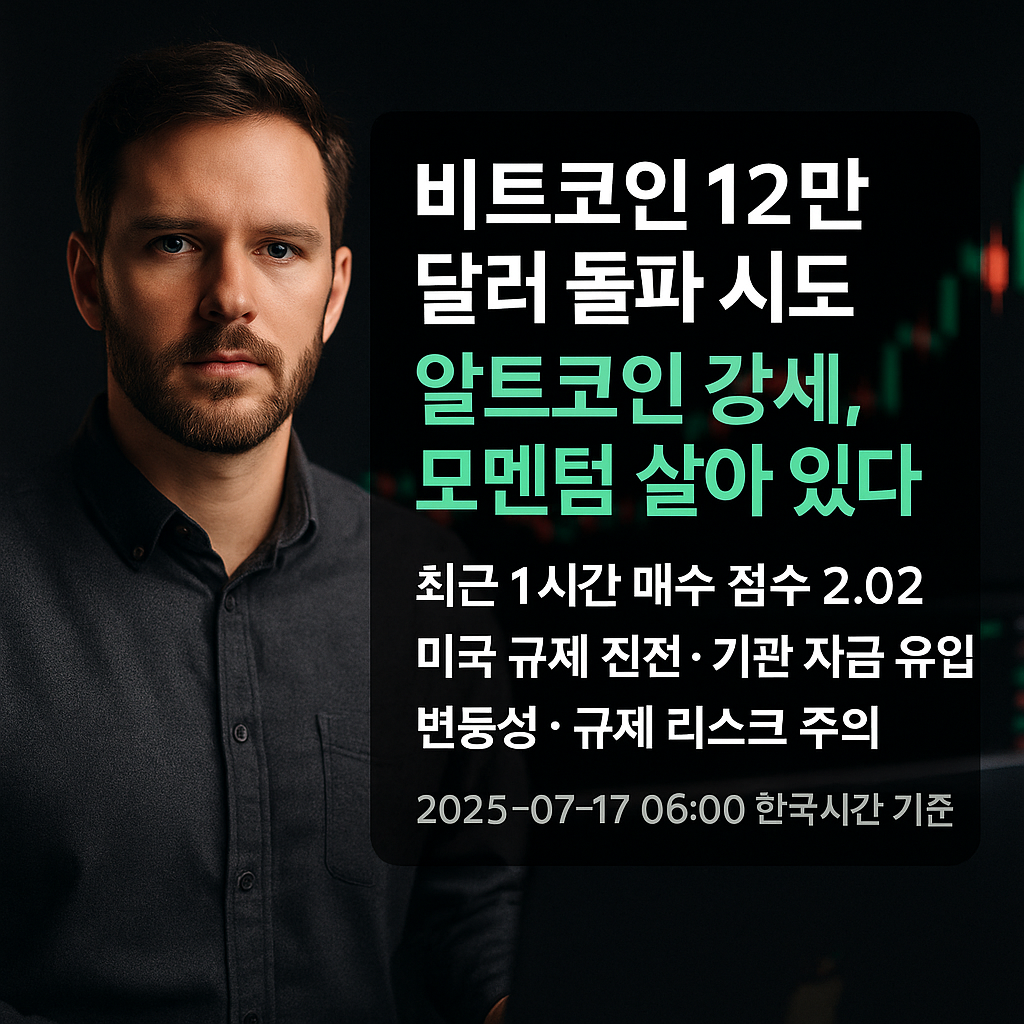2025년 7월 17일 오전 6시 현재, 암호화폐 시장은 비트코인의 12만 달러 돌파 시도와 함께 알트코인들의 강세가 두드러지며 뜨거운 관심을 받고 있습니다. 최근 시장의 움직임은 복합적인 요인들이 얽혀 있어 투자자들의 신중한 접근이 요구됩니다. 지금부터 바이낸스와 업비트의 최신 데이터를 기반으로 시장의 흐름을 심층 분석하고, 향후 전망을 제시해 드리겠습니다.