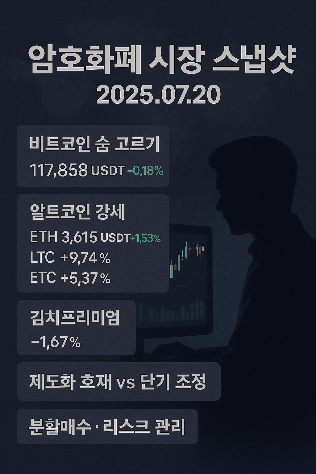 2025년 7월 20일 11시 현재, 암호화폐 시장은 주요 지표와 뉴스 흐름 속에서 숨 가쁜 움직임을 보이고 있습니다. 비트코인이 최고가 경신 후 숨 고르기에 들어간 가운데, 일부 알트코인들이 강세를 보이며 시장의 역동성을 더하고 있습니다. 오늘 이 포스트에서는 최신 데이터를 기반으로 현재 시장 상황을 심층 분석하고, 앞으로의 방향성과 전망을 제시해 드리고자 합니다.