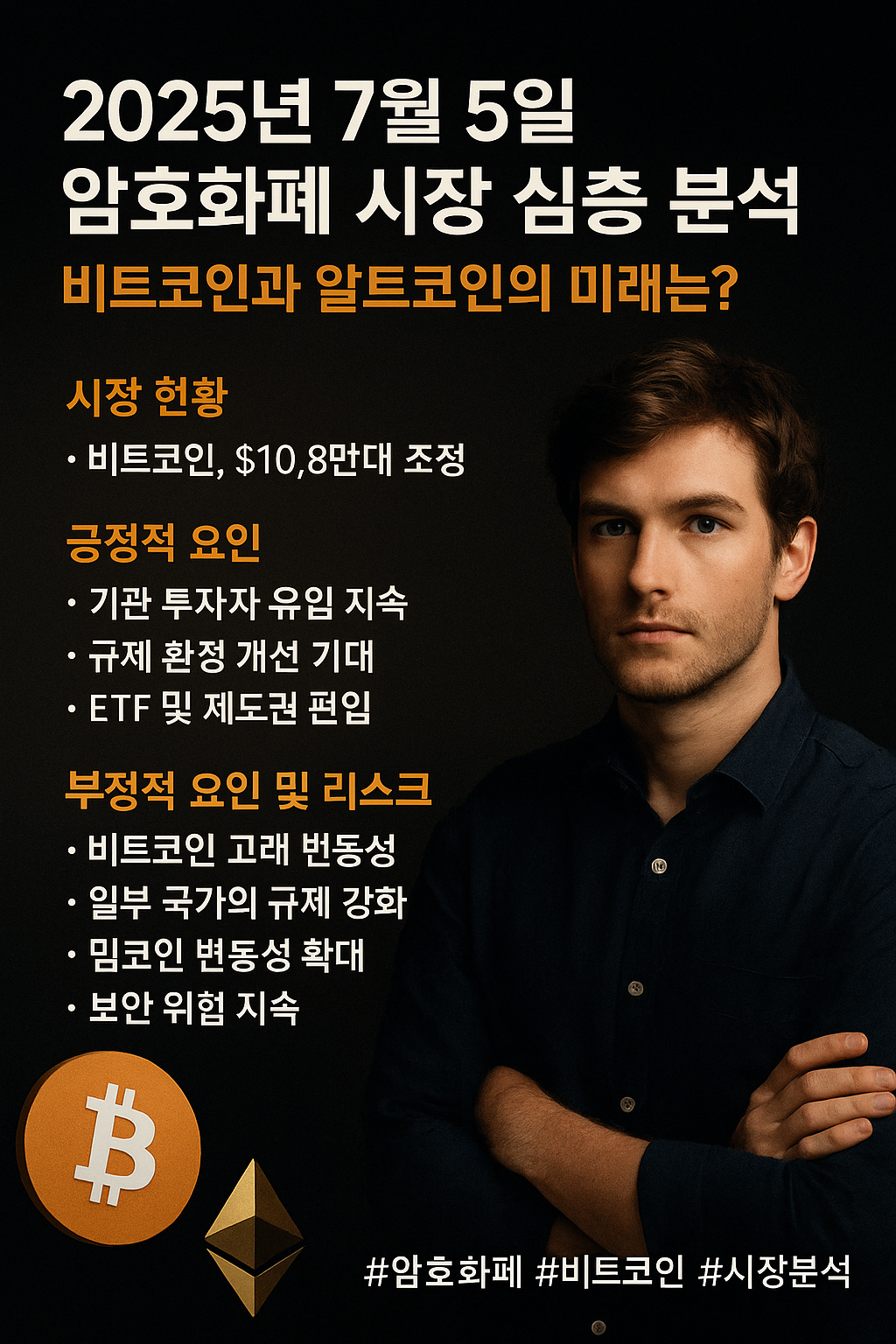 2025년 7월 5일 오전 8시 현재, 암호화폐 시장은 전반적으로 조정 국면에 접어든 모습입니다. 비트코인이 10만 8천 달러 선에서 등락을 거듭하며 주요 알트코인들 또한 하락세를 보이고 있습니다. 그러나 이러한 표면적인 움직임 뒤에는 기관 투자자들의 꾸준한 유입, 규제 환경의 변화, 그리고 온체인 데이터가 보여주는 미묘한 신호들이 복합적으로 작용하고 있습니다. 세계 최고의 코인 데이터 분석 컬럼니스트로서, 오늘 시장의 주요 지표와 최신 뉴스를 종합적으로 분석하여 현재 암호화폐 시장의 흐름과 앞으로의 전망을 심층적으로 제시하고자 합니다.