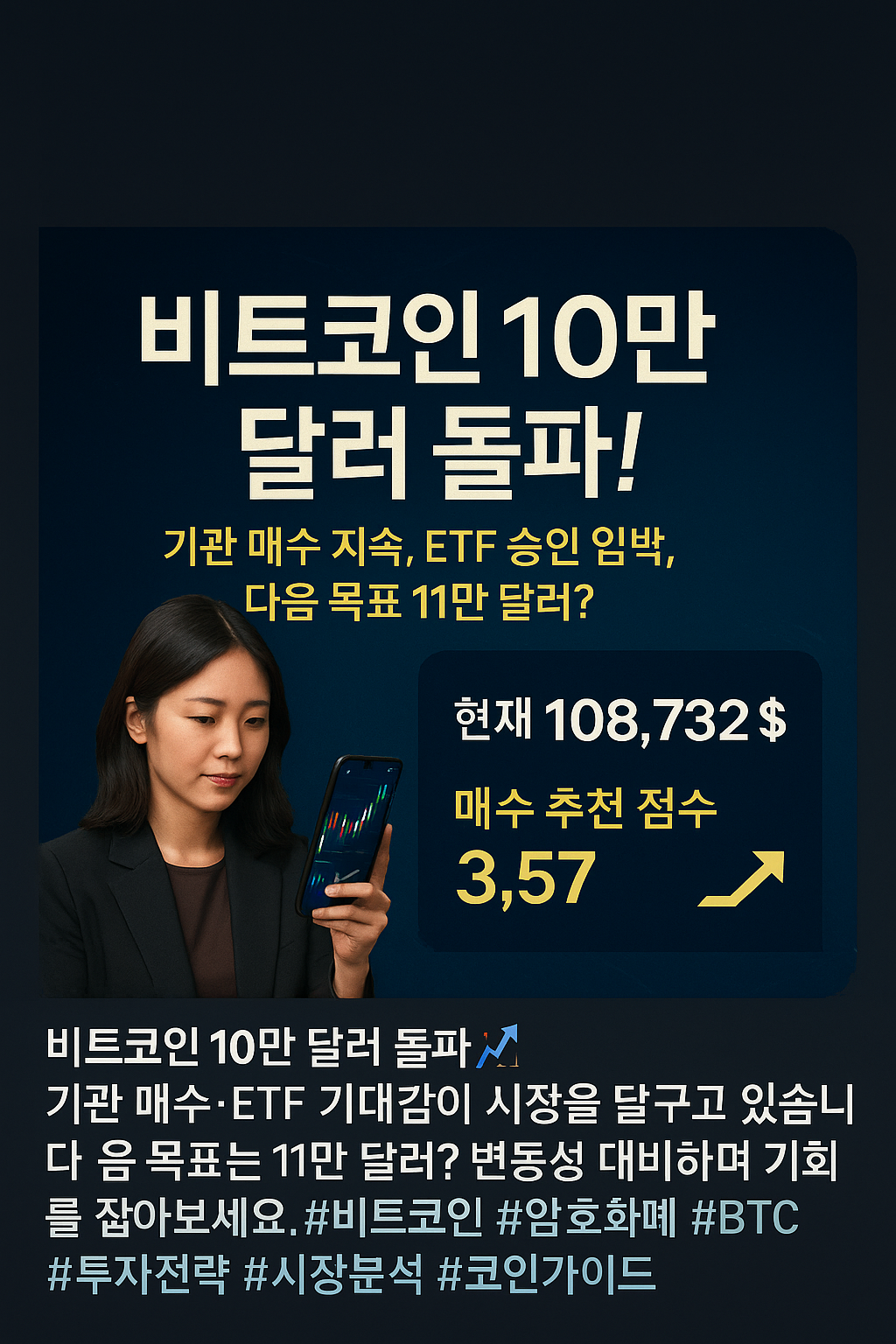 | 2025-07-08T23:59:07 | 2.85 | 비트코인 11만 달러 지지, SEC의 ETF 신청 접수, 기관 대량 매수 등 강한 긍정 시그널. |