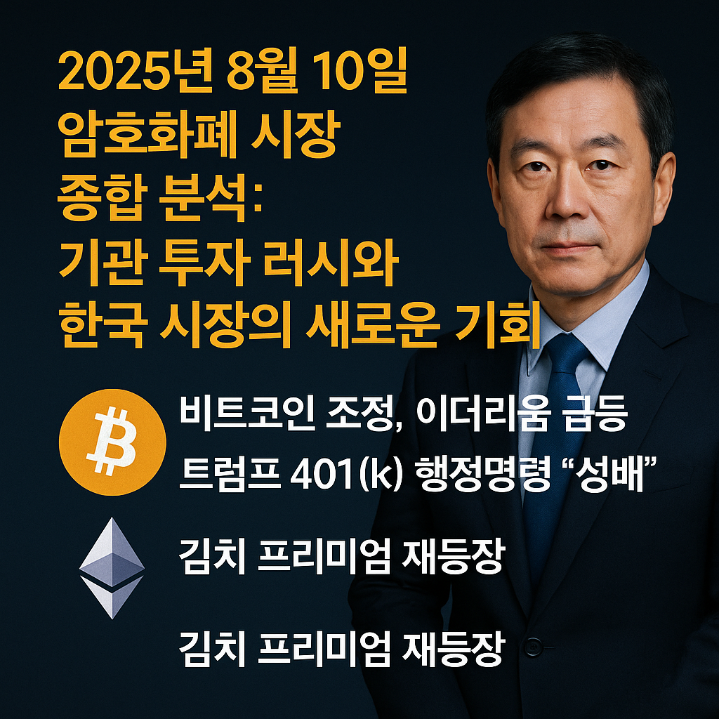 2025년 8월 10일 암호화폐 시장은 비트코인 116,496.90 USDT (-0.29%) 소폭 조정과 이더리움 4,260.91 USDT (+5.89%) 강세가 대비되는 모습입니다. 트럼프 행정부의 401(k) 암호화폐 투자 허용 행정명령과 하버드 대학의 1억 1,600만 달러 비트코인 ETF 투자가 시장에 엄청난 충격파를 일으키고 있습니다. 한국 시장에서는 김치 프리미엄이 3-5%대로 재등장하며 업비트 거래량이 급증하는 중입니다.
