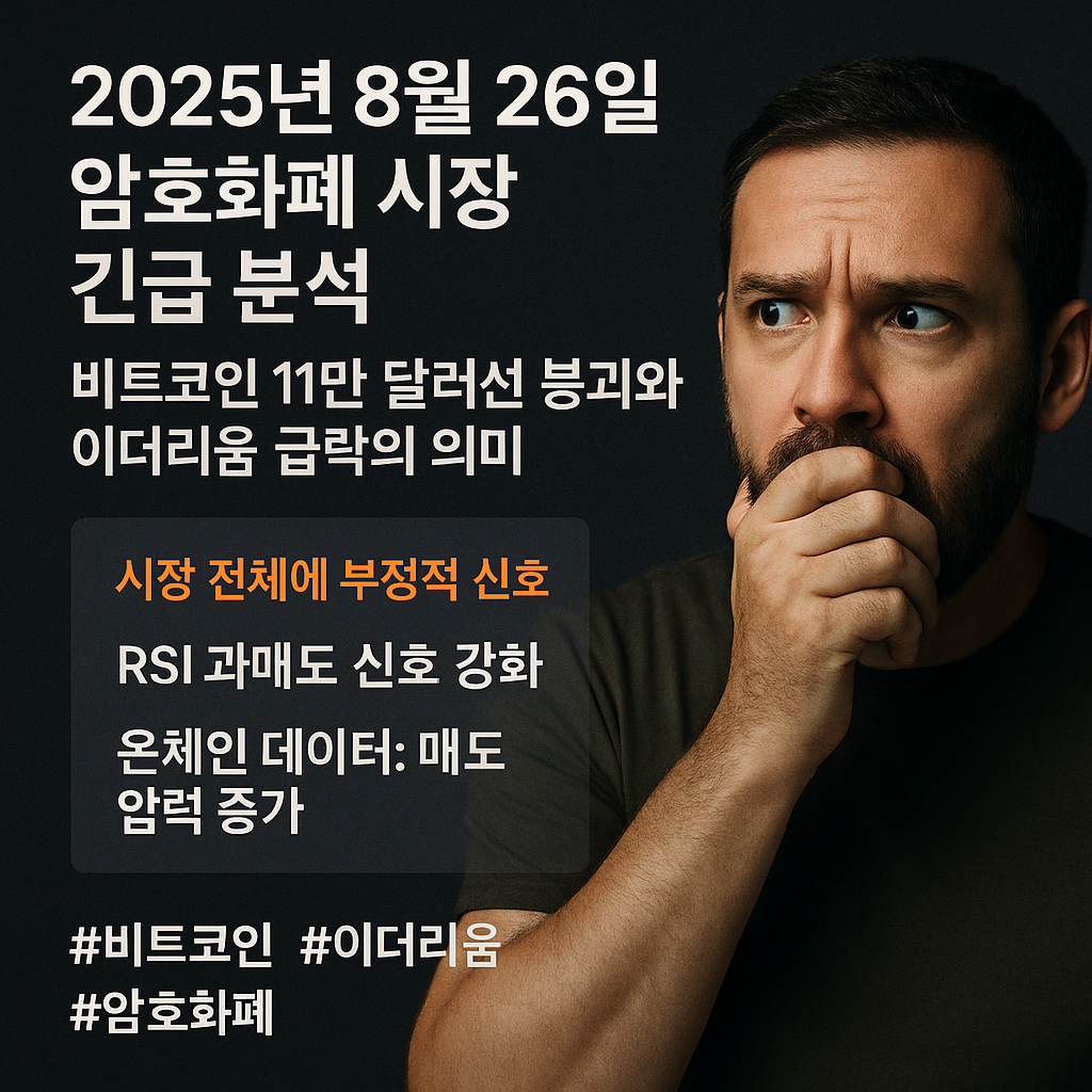 2025년 8월 26일 오전 8시 기준, 암호화폐 시장이 전반적인 하락세를 보이며 투자자들의 우려가 커지고 있습니다. 특히 비트코인이 심리적 지지선인 11만 달러를 하회하며 110,096.8달러(업비트 기준 1억 5,600만원)에 거래되고 있어 시장 전체에 부정적 신호를 보내고 있습니다.