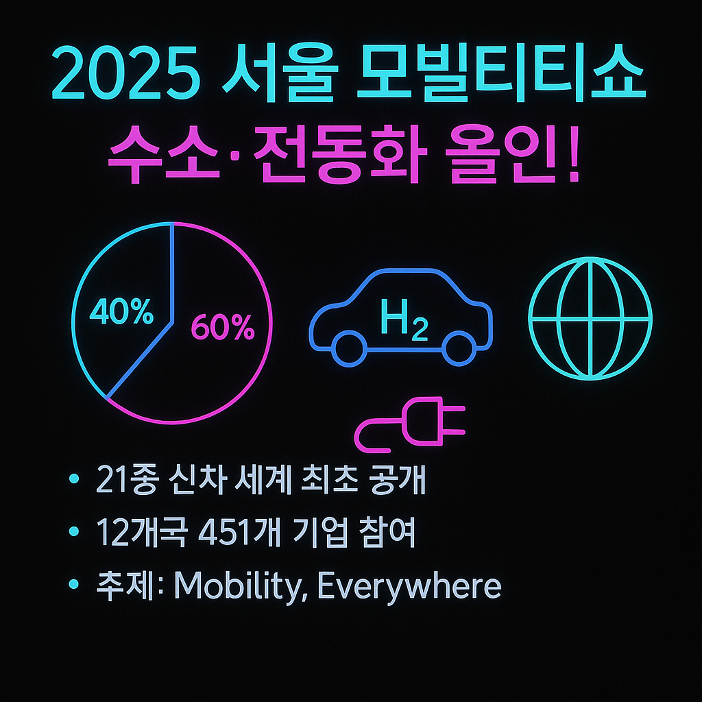 이번 2025 서울 모빌리티쇼는 전기차·수소차 등 친환경 차량부터 UAM까지 미래 이동수단의 모든 것을 한자리에서 볼 수 있다는 점에서 방문할 가치가 충분합니다. 미래 모빌리티 혁신을 직접 체험하고 싶은 분들은 킨텍스로 향해보세요. 눈앞에 펼쳐진 미래 자동차의 세계가 여러분을 기다리고 있습니다!