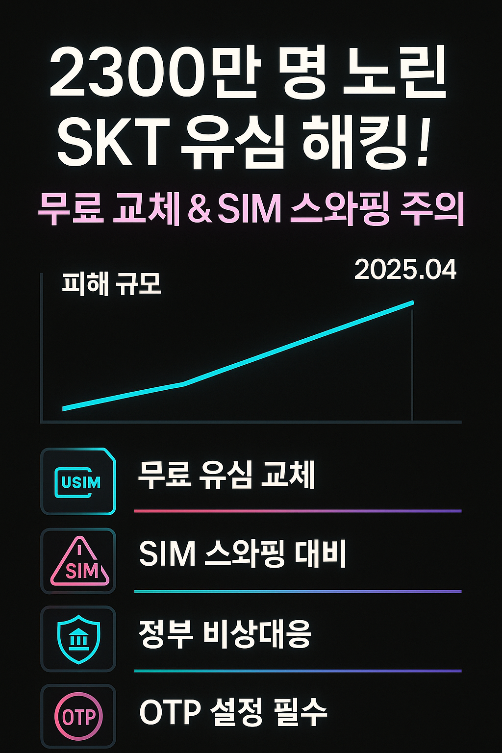 | 교체 안 하면 바로 피해가 생기나요? | 현재까지 ‘즉시 피해’ 사례는 없지만, 유출 정보가 암시장에 유통될 경우 수개월 후 SIM 스와핑에 악용될 수 있어 교체·보호 가입이 안전합니다. |