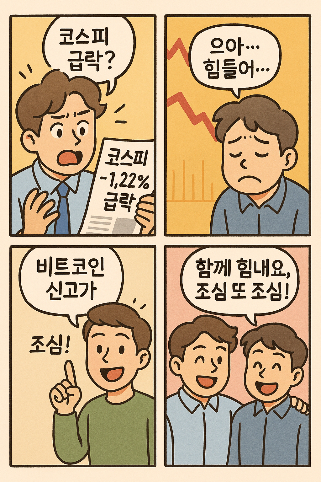 2025-05-23 06:00 기준으로, 국내외 시장의 주요 흐름을 희화 4컷 만화로 가볍게 정리했습니다.
