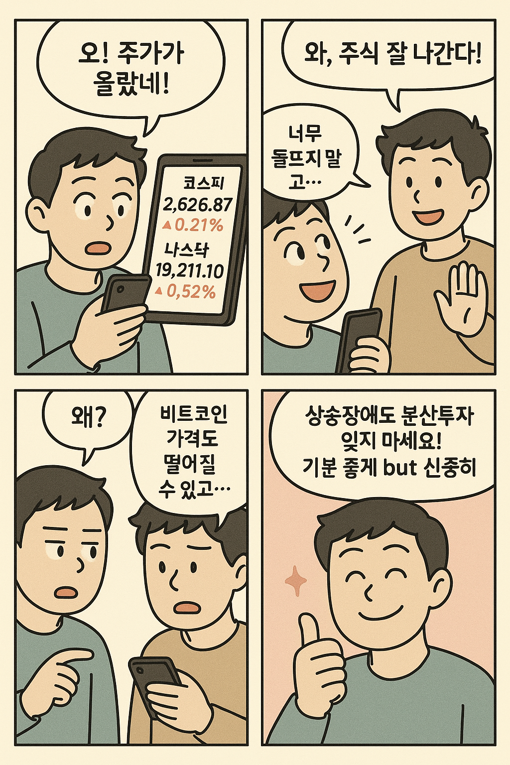 - 2컷 – 친구의 한마디 “너무 들뜨지 말고…” → 시장이 좋을수록 냉정함은 필수!
